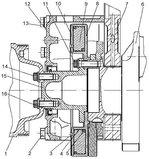 крышка блока; 14 — болты крепления шкива; 15 — фланец отбора мощности; 16 —