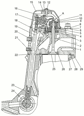 цилиндра; 16 — коромысло; 17 — стойка коромысла; 18, 22 — прокладки; 19 —