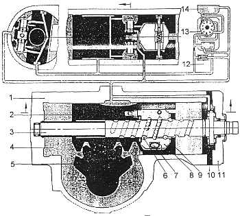 крышка; 12 — клапан ограничения давления; 13 — лопастной насос; 14 — резервуар