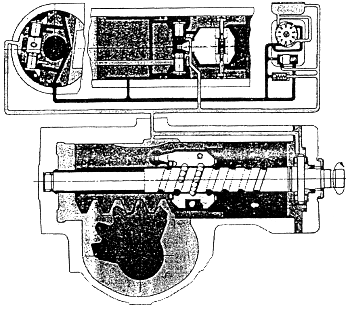 Масло под давлением имеет боковую циркуляцию из-под клапана и попадает в продольный шарнир поршня. Для нивелировки давления масло подается на противоположную сторону, в продольное отверстие одного диаметра, и через горизонтально стоящие отверстия подводится к лобовым площадкам клапанного механизма, которые от цилиндра отсоединены уплотнительными кольцами. В нейтральном положении клапана масло, протекавшее через подводные и обратные распределительные фаски, поступает в среднюю часть клапанного механизма, и потом, через соответствующее отверстие течет вверх, к одному отверстию поршня. Оттуда масло подается в обратную магистраль. При перемещении клапана сторона поршня, на которой действует давление, отсоединяется от обратной магистрали, а противоположная сторона цилиндра связывается с обратной магистралью. Клапан управления имеет два поршня обратного действия, задачей которых является затруднение перемещения клапана из нейтрального положения, в зависимости от давления масла. Таким образом, усилие управления на руле повышается и становится пропорциональным усилию, создаваемому на колесах.