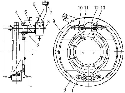 Тормозные механизмы (см. рисунок) установлены на всех ступицах колес автобусного шасси, основной узел тормозного механизма смонтирован на суппорте, жестко связанном с фланцем моста.