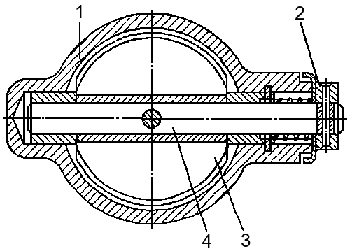 Каждый механизм состоит из сферического корпуса 1 и заслонки 3, закрепленной на валу 4. На валу заслонки закреплен также поворотный рычаг 2, соединенный со штоком пневмоцилиндра. Рычаг и связанная с ним заслонка имеют два фиксированных положения тормозного механизма.