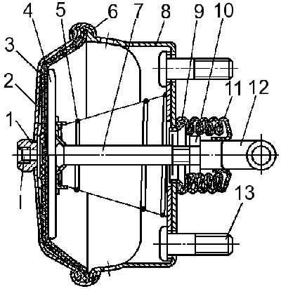 Полость над мембраной через резьбовой штуцер 1 в крышке 2 соединена с подводящей магистралью рабочей тормозной системы. Мембрана 3 зажата между корпусом 8 камеры и крышкой 2 стяжным хомутом 6, состоящим из двух полуколец. Полость под мембраной соединена с окружающей средой через дренажные отверстия, выполненные в корпусе 8 камеры. Камера прикреплена к кронштейну двумя болтами 13, приваренными к фланцу, который вставлен в корпус 8 камеры изнутри и прижат к дышлу корпуса возвратной пружиной 5. Цифра 24 в обозначении типа камеры указывает активную площадь мембраны камеры в квадратных дюймах при нормальном ходе штока тормозной камеры.