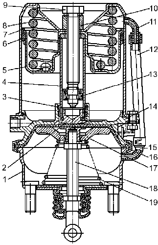 Пружинные энергоаккумуляторы вместе с тормозными камерами установлены на кронштейне тормозных камер тормозных механизмов заднего моста. Шток 18 тормозной камеры связан с регулировочным рычагом тормозного механизма. Дренажная трубка 12 служит для исключения вакуума над поршнем 5 при перемещении его вниз и противодавления при ходе вверх. При торможении рабочей тормозной системой сжатый воздух направляется в полость над мембраной 16. Мембрана воздействует на шток 18 тормозной камеры, который выдвигается и приводит в действие тормозной механизм колеса. При выпуске воздуха шток и мембрана возвращаются в исходное положение возвратной пружиной 19.