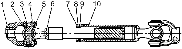 Карданный вал имеет скользящее шлицевое соединение, обеспечивающее возможность изменения расстояния между шарнирами.