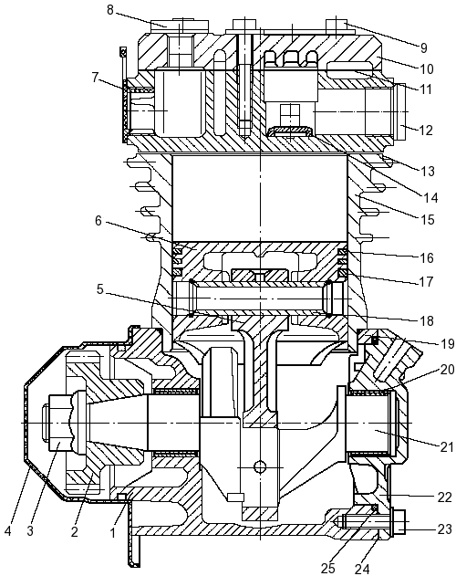 скольжения; 21 — коленчатый вал; 22 — крышка картера; 25 — уплотнительное