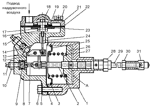 Через резьбовое отверстие крышки 21 в полость мембраны подводится воздух из впускного коллектора двигателя. При снижении давления воздуха ниже 0,04 МПа (0,4 кгс/см2) усилие пружины корректора 7, действующей на золотник становится больше усилия, создаваемого давлением наддувочного воздуха на мембрану и передающегося через шток мембраны и рычаг корректора также на золотник. Золотник перемещается вправо до тех пор, пока не наступит равновесие сил, действующих на него.