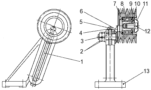 В шкив 7 запрессован двухрядный шариковый подшипник 8 с двухсторонним уплотнением. Смазка в подшипник заложена заводом-изготовителем. От осевых перемещений наружная обойма подшипника зафиксирована упорным кольцом 9, внутренние обоймы — шайбой 10 и болтом 12. Ось натяжного ролика вставлена в продольный паз кронштейна 13 крепления опоры вентилятора. Гайки 2 стягивают ось 3 и удерживают ролик от перемещения вдоль продольного паза в кронштейне 13. В оси натяжного ролика выполнено резьбовое отверстие, в которое ввернут болт-натяжитель 1.