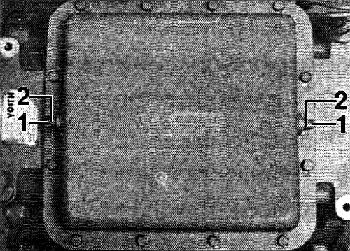 - вывернуть два винта (1), расположенные на переднем и заднем торцах верхней крышки ГМП, удалить с них распорные втулки (2) и завернуть винты до упора;