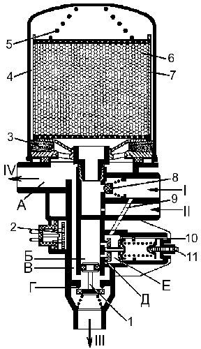 Из регенерационного ресивера воздух через дроссельное отверстие стремится к нижней части картриджа 7 с гранулятом. При расширении и протекании воздуха снизу вверх через картридж с гранулятом влага, осевшая на поверхности гранулята 6 вместе с воздухом выводится наружу по каналу В через открытое выпускное отверстие Г и выход III.
