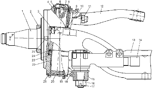 уплотнительное кольцо; 22 — втулка распорная; 23 — подшипник роликовый упорный;