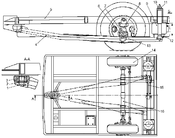 амортизатор; 13 — штифт; 14 — колесо; 15 — штанга; 16 — балка передней оси; Б =