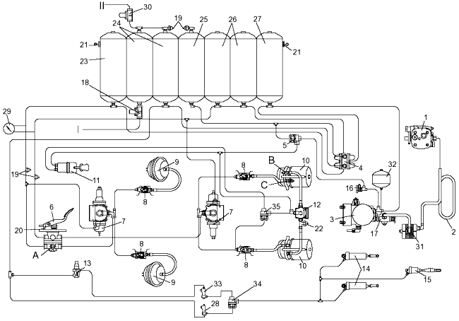 Контур II привода рабочей тормозной системы заднего моста состоит из секции четырехконтурного защитного клапана 4; двух ресиверов 26 общим объемом 40 л с кранами слива конденсата и выключателями сигнализаторов падения давления в контуре; верхней секции двухсекционного тормозного крана 6; клапана контрольного вывода В; регулятора 7 тормозных сил; двух тормозных камер 10 с пружинными энергоаккумуляторами; трубок и шлангов между этими аппаратами.