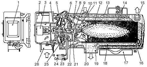форсунка; 13 — теплообменник; 14 — термопредохранитель; 15 — патрубок «выхода»;