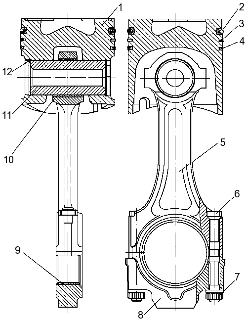 Поршень с шатуном (см. Рисунок 35 — Поршень с кольцами в сборе с шатуном) соединены пальцем 11 плавающего типа, его осевое перемещение ограничено стопорными кольцами 12.