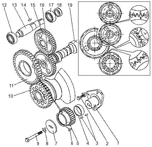 На хвостовик распределительного вала напрессовано зубчатое колесо 16 (с модулем зуба 3 мм), угловое расположение которого относительно кулачков вала определяется шпонкой. Зубчатое колесо 15 привода ТНВД установлено на вал 13 привода ТНВД с натягом и ориентируется шпонкой 14.
