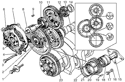 привода распределительного вала; 21, 22 — кольца упорные; 23 — ведущее зубчатое