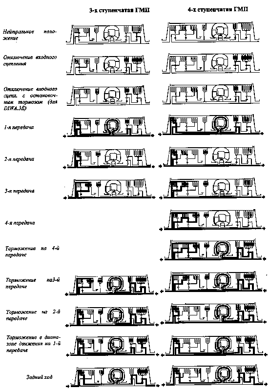 Рисунок 269 — Схемы передачи крутящего момента на различных режимах работы ГМП