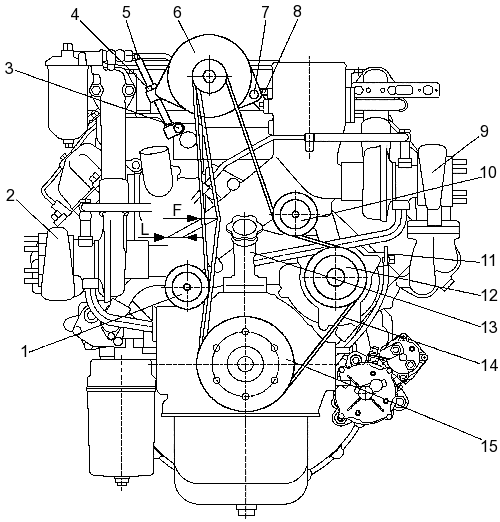 маслоналивной патрубок; 14 — поликлиновой ремень; 15 — шкив коленчатого вала; F
