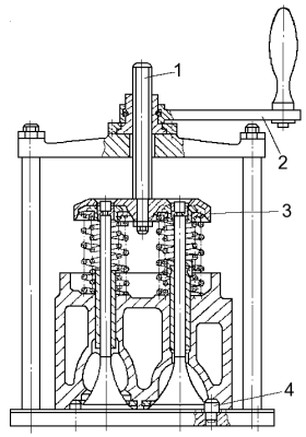 - вращая вороток 2, вверните винт 1 и тарелкой 3 отожмите пружины клапанов;