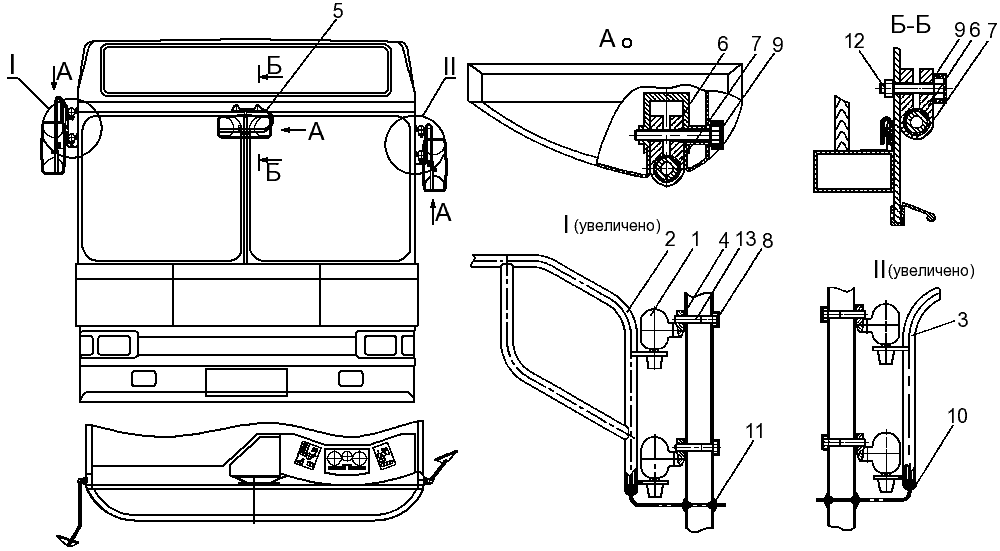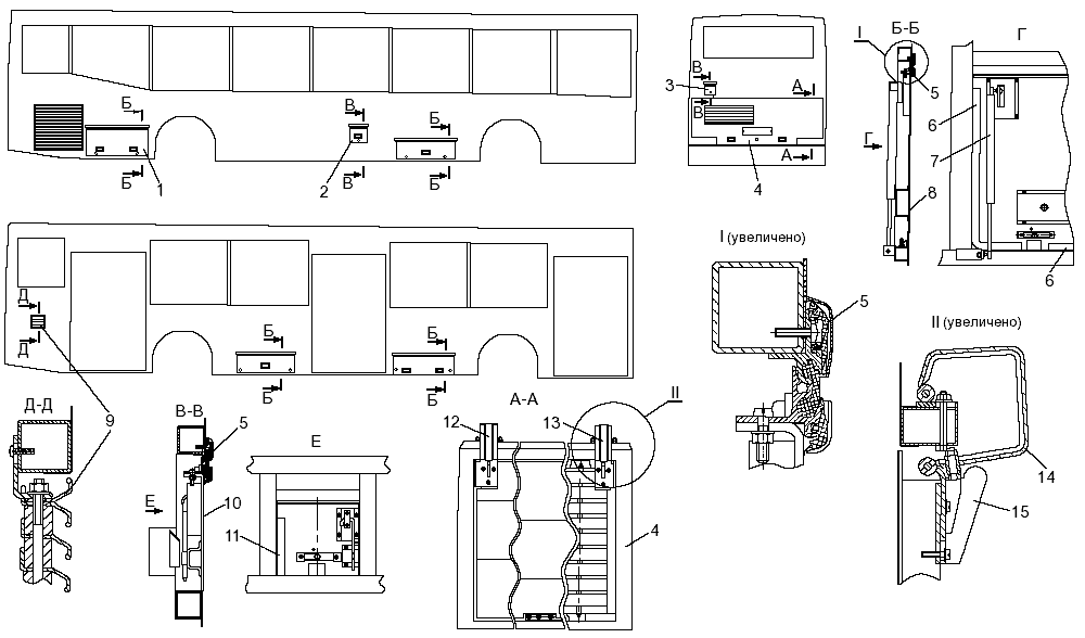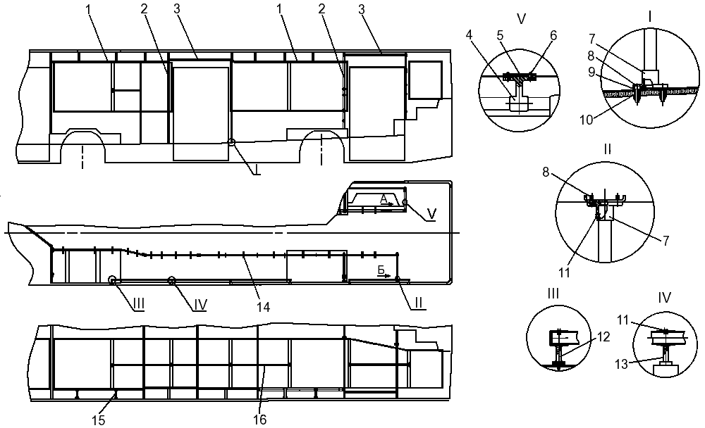 12, 13 — кронштейны поручня; 14 — подвесные ручки поручней; I - V — фрагменты