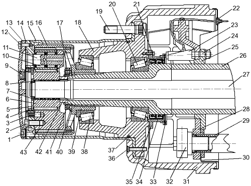 — кольцо уплотнительное; 39 — ступица коронного колеса; 41 — гайка подшипников;