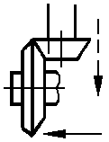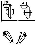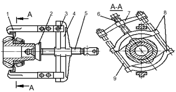 Завести захваты 1 за клинья 8 и зафиксировать их в этом положении винтом 3. Упирая наконечник 2 в торец колеса, и вворачивая винт 3 в траверсу 4, снять кольцо.