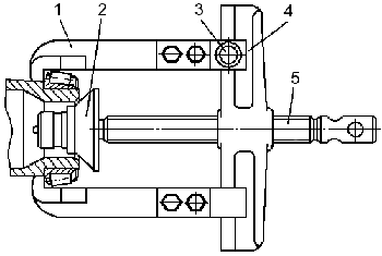 Упираясь наконечником 2 в торец дифференциала, ввертывать винт 5 в траверсу 4 до полного снятия внутреннего кольца подшипника.