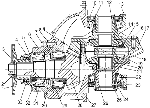 Для разборки дифференциала (см. Рисунок 137 — Главная передача заднего моста) нужно снять стопорное кольцо и зубчатую муфту 25 механизма блокировки дифференциала. Вывернуть винты 13, снять стопорные пластины и регулировочные резьбовые гайки 10. При необходимости замены спрессовать подшипники 11 и 22 с чашек 12 и 26 дифференциала.