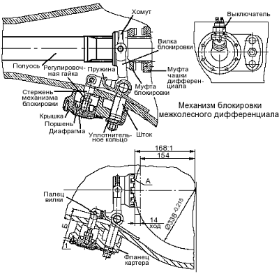 - установите муфту блокировки в положение, при котором расстояние от плоскости А зубчатого венца муфты до оси отверстия (d = 338+0,215) мм в картере моста составляет 170 мм;