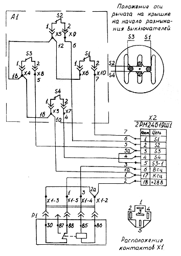 Концевые выключатели 81, 82, 83, 84 (см. Рисунок 330) в исходном положении (рукоятка 1 РУКП расположена по центру) замкнуты и обесточены (электропитание на РУКП отсутствует).