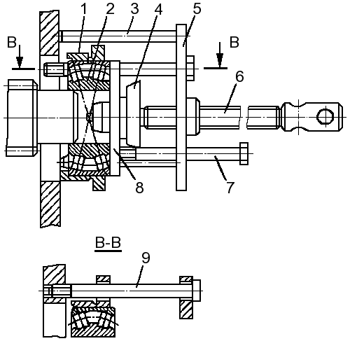 - для установки заднего подшипника промежуточного вала со стаканом на вал, размещенный в коробке передач и поджатый передней крышкой, использовать съемник И801.31.000. Для этого установить на наконечник 4 (Рисунок 128 — Приспособление для установки заднего подшипника промежуточного вала) шайбу 8, пропустить болты 9 через отверстие в стакане, ввернуть их в резьбовые отверстия на картере коробки передач до упора. Упираясь шайбой 8 в подшипник, вворачивать винт 6 в плиту 5 до полной установки стакана с подшипником;