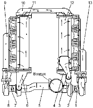 патрубок впускной правый; 8 — патрубок впускной левый; 9, 12 — коллектора