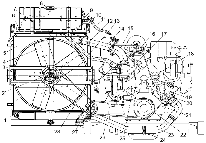 19 — водяной насос; 20 — корпус водяных каналов; 21, 26, 28 — ремни привода; 22