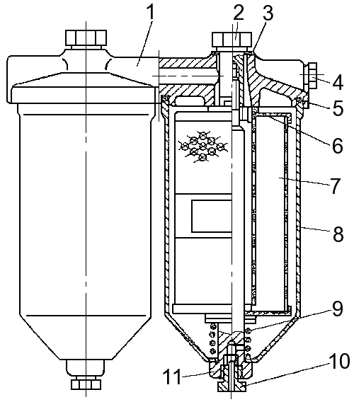 фильтрующего элемента; 10 — пробка сливного отверстия; 11 — стержень