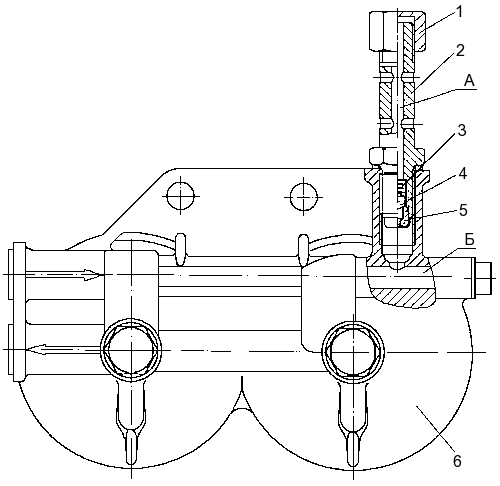 Клапан представлен на одноименном рисунке (рис. 47). При достижении давления в полости Б подвода топлива 25-45 кПа (0,25-0,45 кгс/см2) происходит перемещение шарика 4 и перетекание топлива из полости Б в полость А через жиклер 5 клапана. При давлении 200-240 кПа (2-2,4 кгс/см2) обеспечивается полное открытие клапана и перепуск топлива в топливный бак через полость А.
