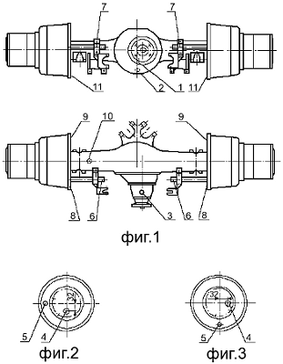 - Вывернуть отмеченые болты поз. 5 (фиг. 3) из колесных редукторов и поз. 2 (фиг. 1) из картера главной передачи (балки).