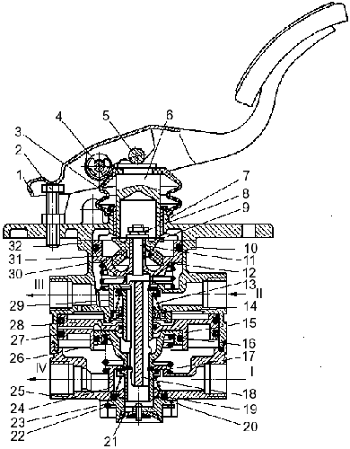 упругий элемент; 32 — верхний корпус; I, II — ввод от ресивера; III, IV — вывод