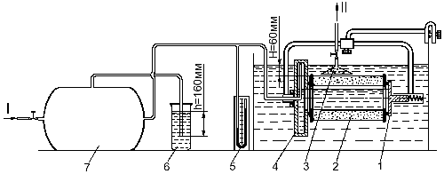 - подать внутрь элемента воздух под давлением 1,6 кПа (160 мм вод. ст.). Это давление устанавливается и поддерживается постоянным жидкостным клапаном 6, трубка которого погружена в воду на глубину 160 мм. Во избежание разрушения фильтрующей шторы элемента давление воздуха не должно повышаться даже кратковременно свыше 2,0 кПа (200 мм вод. ст.);