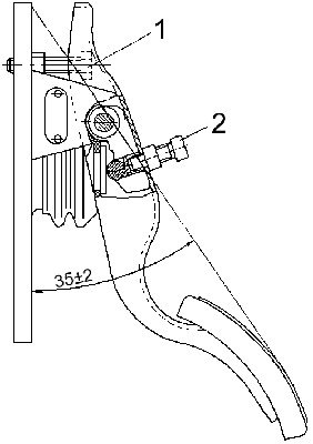 - отрегулировать положение тормозной педали относительно плиты тормозного крана с помощью установочного и регулировочного болтов. Площадка педали от плиты крана должна быть расположена под углом (35 ± 2) °, а свободный ход педали — (10-15) мм. После регулировки установочный болт должен быть зафиксирован контргайкой. Регулировочный болт перед регулировкой покрыть герметиком;
