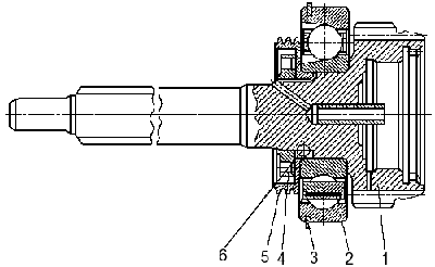Полость подшипника заполняется смазкой ЦИАТИМ 201 и уплотняется манжетой. На задний конец вала с упором в торец зубчатого колеса установлены шариковый подшипник 2 и маслонагнетающее кольцо 5, стопорящееся от проворачивания на валу шариком 6. Пакет стягивается кольцевой гайкой 4, поясок которой вдавливается в пазы вала.