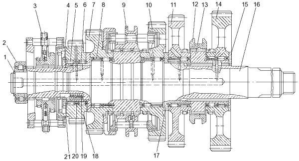 Вторичный вал коробки передач (см. рисунок) в сборе с зубчатыми колесами и синхронизаторами установлен соосно с первичным валом.