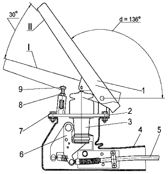 Привод управления подачей топлива — механический: педаль 1 (см. Рисунок 13 — Установка педали подачи топлива) управления подачей топлива связана с рычагом управления регулятора частоты вращения ТНВД тросовым приводом.