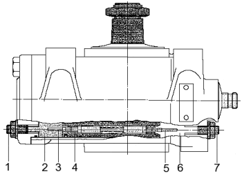 Клапан, «обслуживающий» две рабочие полости цилиндра гидроусилителя рулевого управления, размещен в поршне 4 рулевого механизма и управляется так, что при подходе поршня к крайнему положению (или раньше к положению, заданному при регулировке) стержень клапана 3 (или 5) упирается в регулировочный винт 1 (или 7), перемещается в противоположную сторону и открывает сообщение между полостями 2 и 6, а значит, и сообщение полости высокого давления со сливом.