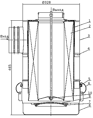 Рисунок 27. Фильтр воздушный: 1 — предочиститель; 2 — элемент фильтрующий; 3 — корпус; 4 — завихритель; 5 — уплотнительное кольцо; 6 — защелка; 7 — перегородка бункера; 8 — крышка; 9 — заглушка; 10 — гайка.