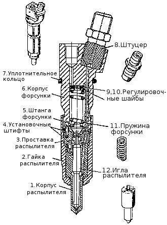 Форсунка (см. рис. Форсунка) закрытого типа, с пятисопловым распылителем и гидравлическим управлением подъёма иглы мод. 273-31 для двигателя КамАЗ 740.11-240. мод. 273-21 с распылителем ЯЗДА или мод. 273-51 с распылителем Bosch для двигателей 740.13-260 и 740.14-300. Все детали форсунки собраны в корпусе 6. К нижнему торцу корпуса форсунки гайкой 2 присоединены проставка 3 и корпус 1 распылителя внутри которого находится игла 12. Корпус и игла распылителя составляют прецизионную пару.