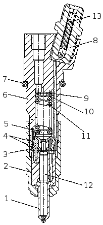 Топливо к форсунке подается под высоким давлением через штуцер 8 со встроенным в него щелевым фильтром 13, далее по каналам корпуса 6, проставки 3 и корпуса распылителя 1 - в полость между корпусом распылителя и иглой 12 и, поднимая её, впрыскивается в цилиндр двигателя.