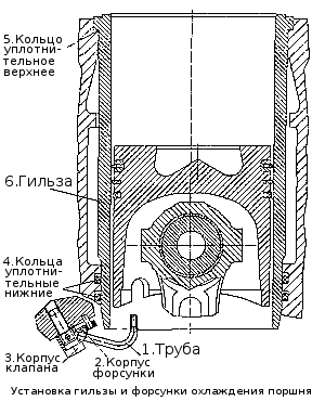 Форсунки охлаждения (рис. Установка гильзы и форсунка охлаждения поршня) устанавливаются в картерной части блока цилиндров и обеспечивают подачу масла из главной масляной магистрали при достижении в ней давления 0,8 - 1,2 кг/см2 (на такое давление отрегулирован клапан, расположенный в каждой из форсунок) во внутреннюю полость поршней.