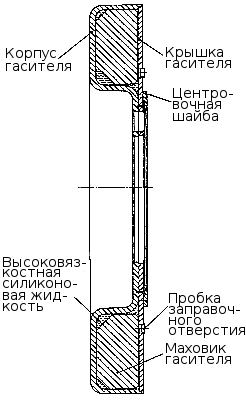 Гаситель крутильных колебаний закреплен восемью болтами 2 (рис. Установка гасителя крутильных колебаний коленчатого вала) на переднем носке коленчатого вала. С целью исключения повреждения поверхности корпуса гасителя под болты устанавливается шайба 5. Гаситель состоит из корпуса (см. рисунок) в который установлен с зазором маховик. Снаружи корпус гасителя закрыт крышкой. Герметичность обеспечивается закаткой (сваркой) по стыку корпуса гасителя и крышки. Между корпусом гасителя и маховиком находится высоковязкостная силиконовая жидкость, дозированно заправленная перед заваркой крышки.