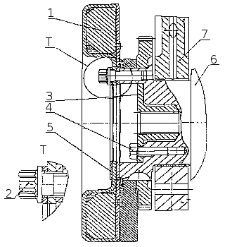 Установка гасителя крутильных колебаний коленчатого вала: 1 — гаситель; 2 — болт крепления гасителя; 3 — полумуфта отбора мощности; 4 — болт крепления полумуфты; 5 — шайба; 6 — коленчатый вал; 7 — блок цилиндров
